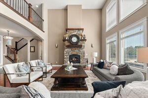 This property truly offers the perfect “forever” home with an inviting & well-designed layout. The main floor provides an open living room centered around a striking rock accent fireplace. Dining room seamlessly connects from the LR to the kitchen and offers access to the partially covered deck & back yard. Kitchen features an island with an eat-up bar, granite, soft-close cabinets, double ovens, walk-in pantry & separate breakfast nook. Luxurious primary on main has double doors, spacious bathroom w/ garden tub, separate shower, dual sinks, and walk-in closet. The junior suite on main has vaulted ceilings, full bath & jetted tub. Additional highlights include a laundry room w/access to finished garage, an upstairs reading nook, 4 bedrooms, and a full bath. Largest bedroom upstairs is used as a family room featuring a kitchenette w/ quartz counters, sink & frig. Set on a full acre, fenced back yard w/ sprinklers, mature fruit orchard, garden beds, fire pit & plenty of space to park your RV or build a shop!