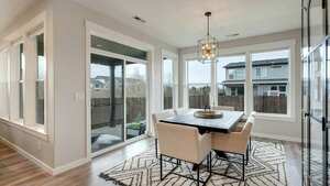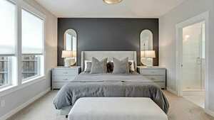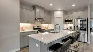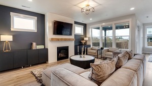 The light-filled living spaces feature high ceilings, creating an airy and inviting atmosphere. The great room includes a cozy gas fireplace, while the modern kitchen showcases a spacious island, quartz countertops, and stainless steel appliances, along with built-in under-cabinet lighting and soft-close drawers and cabinets.