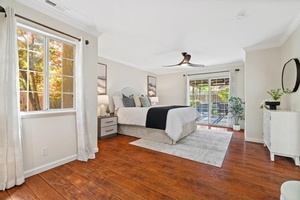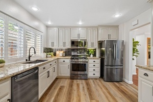 Exceptional 3 Bedroom, single-story Blossom Valley home radiating Pride of Ownership. Set on a pristine Corner Lot, the meticulously maintained exterior delivers undeniable curb appeal. Thoughtfully designed floorplan with smooth, connected spaces. Natural light from 2 skylights. Oversized Primary Bedroom is a Private Retreat, featuring seating nook, mirrored closet drs, ceiling fan & a slider w/ direct patio access. French doors w/ decorative glass panels add charm flexibility to the 3rd Bed - home office or bedrm. Updated Kitchen w/ granite countertops, tile backsplash, black SS appliances, gas stove, built-in microwave.