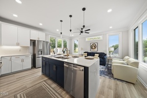 The open-concept great room flows seamlessly into a chef-inspired kitchen showcasing 42-inch cabinetry, quartz waterfall island, and coordinating hardware-ideal for everything from quiet breakfasts to lively gatherings.