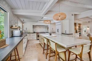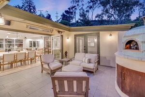 Light & bright open concept living with a thoughtfully designed kitchen as the focal point of the home, featuring timeless wide-plank French oak floors, marble & basalt counters, LaCantina doors & windows and high-end appliances from Sub-Zero, Wolf & Miele. Kitchen opens to living room with bar, dining area & family room. Off the kitchen is a private rear patio that features built-in Lynx & Evo grills, wood-fired pizza oven and plumbed patio heater. Several other outdoor areas to enjoy as well within this gated & fully fenced hideaway.