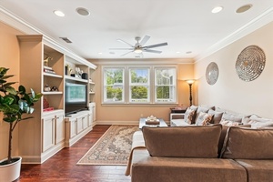 Family Room w/ built-in shelving, Recessed Lighting throughout, Custom-Control built in fan/light switches, Three-piece Crown Molding on the first floor, traditional Crown Molding upstairs, Tankless Gas water heater, Dual-panel 400 Amp electrical service, Six Zone Irrigation System, All-Weather-Black Aluminum, fully fenced, rear yard, Resplendent Landscaping, and a transferable termite bond!