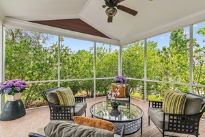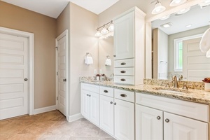Expansive 1st floor Owner’s Suite with a grand, customized walk-in closet, custom tiled shower, separate tub with jets and French doors with Imbedded Blinds leading out to your private screened porch.