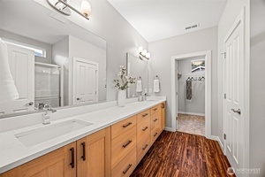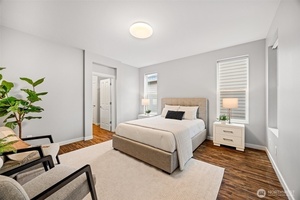 Enjoy the ease of rambler-style living with added bonus of rare upstairs loft in sought-after 55+ Trilogy at Tehaleh! This stunning 2 bed + bonus/2.5 bath residence features two main-floor primary suites with private bathrooms. Upstairs, a spacious bedroom/bonus room and full bathroom offer endless possibilities-guest suite, office, hobby space and more!