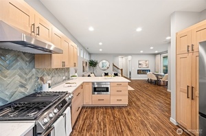 Expertly remodeled with high-end finishes throughout! Fully updated kitchen/bathrooms/laundry feature custom-made white oak cabinetry and Quartz countertops. All new LVP flooring/carpet, new custom window shades/drapes and new stainless steel appliances with gas range.
