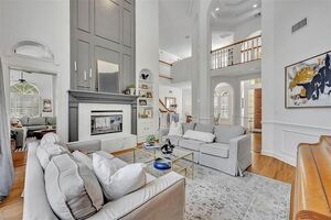 Upstairs is a large loft area with built in bookshelves and enough space to have a pool table. My favorite details are the custom features in every area of this house, from built-in bookcases & china cabinets, a Juliet balcony to a spiral staircase, the pool’s rock waterfall, and even walk-in attic access from the bedroom upstairs.