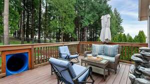 The primary suite is a private retreat, complete with French doors and ceiling fan, a spa-like jetted tub, a separate shower, and a generous walk-in closet. Fully finished lower level provides fantastic flexibility, featuring a 4th bedroom, full bath, a kitchen and sliding doors that open to a patio with a fire pit-an ideal space for guests or rental potential. Nestled against serene forest land for ultimate privacy, this home is also conveniently located near popular restaurants and a scenic park, offering the perfect blend of tranquility and accessibility.