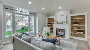 The great room is a true centerpiece, featuring a cozy gas fireplace with custom built-ins, perfect for both relaxation and entertaining. A formal dining room with solid hardwood floors opens to the backyard through elegant French doors, offering seamless indoor-outdoor living. The spacious kitchen is a chef’s delight, showcasing gleaming quartz countertops, ample cabinetry, and hardwood floors that flow effortlessly into the dining area. A bright nook overlooks the meticulously landscaped yard, creating a warm and inviting space for casual meals.