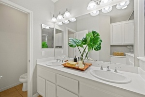 A convenient bedroom and full bathroom on the main level provide flexibility for multi-generation living or guests or a home office. Upstairs, enjoy two generously sized bedroom suites with attached full bathroom, including a beautiful primary retreat with a walk-in closet and an ensuite bathroom with double vanity sinks.
