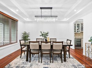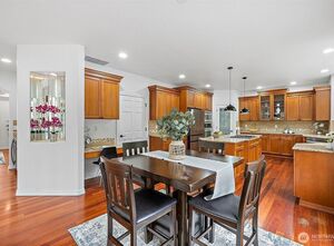 The elegant master suite boasts a gas fireplace, a sitting area, and a 5-piece bathroom with a soaking tub. The property includes a 4-car tandem garage, RV/boat parking, and a low-maintenance backyard with raised garden beds. Enjoy the absence of an HOA and the proximity to shopping, dining & Lake Tapps.