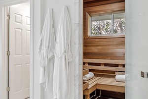 The first-floor primary suite is a serene retreat with a dry sauna, grand marble walk-in shower, spacious custom closet, and outdoor access. Three additional bedrooms offer en-suite baths with marble counters and floors, enhancing the home’s elegance. A built-in, locked custom watch display adds a unique touch of luxury.