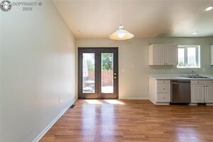 The kitchen is both functional and inviting, featuring durable laminate flooring, newer appliances, ample counter space, and a convenient pantry for extra storage. Outside, the back yard is fully fenced and features a small patio area with a hot tub, perfect for relaxing.