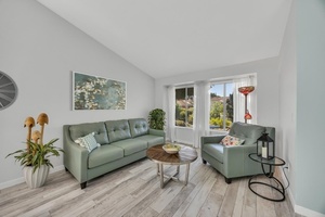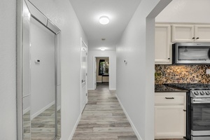 Inside, the layout flows naturally, providing space to live, work, and entertain with ease. The recently remodeled kitchen with quartz countertops and updated flooring blends style and practicality, ideal for everyday living or hosting. The primary bedroom includes direct access to the backyard and its pergola-covered patio, creating a seamless indoor-outdoor connection. With no neighbors directly behind, the private backyard backs to a greenbelt and offers a peaceful, tree-lined view. Whether you’re enjoying a quiet morning or hosting an evening outdoors, the setting is both serene and functional.