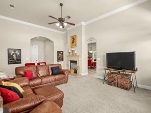Step inside to be greeted by vaulted ceilings and a cozy dual sided fireplace that connects the living and dining areas with tons of natural light, wooden blinds, beautiful crown molding, wide baseboards, and designer paint throughout. French doors from the living room lead to the covered patio, perfect for entertaining.