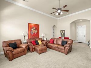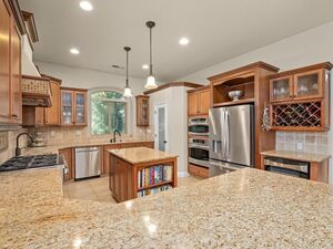 The chef’s kitchen is the heart of this home, featuring granite countertops, a six-burner gas cooktop, dual ovens, two sinks, a wine/beverage refrigerator, a walk-in pantry, and upgrades like pull-out shelving and lazy susans for maximum functionality. Brand new appliances include a convection/microwave oven, dishwasher, faucets, garbage disposal, and premium water heater.