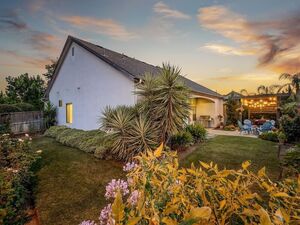 Retreat to the spacious primary suite with a walk-in closet and large bathroom with separate shower and soaking tub. Primary is complete with French doors leading out to the backyard oasis. Entertain or unwind under the pergola surrounded by lush landscaping, fruit trees (pomegranate, lemon, navel orange), grape vines, a vegetable and herb garden with squash, tomatoes, bell peppers, basil, oregano, and a spacious side yard with multiple beautiful roses.