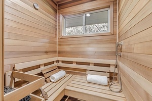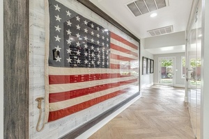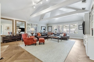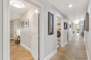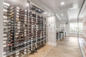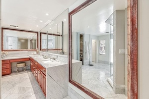 The first-floor primary suite is a serene retreat with a dry sauna, grand marble walk-in shower, spacious custom closet, and outdoor access. Three additional bedrooms (3 upstairs and two downstairs) offer en-suite baths with marble counters and floors, enhancing the home’s elegance. A built-in, locked custom watch display adds a unique touch of luxury.