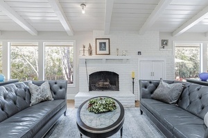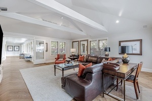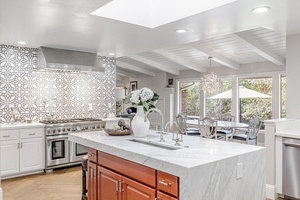 Set in a private, secure setting, the backyard oasis features a pool, spa, outdoor kitchen, and a wood-fired pizza oven. A gas firepit with custom metal logs invites cozy gatherings, while citrus trees & raised garden beds provide homegrown flavors. The indoor laundry room has ample room + sink, and the three-car garage features epoxy floors, EV charging station, a workbench, tool storage, and pull-out workspace.