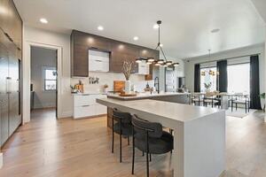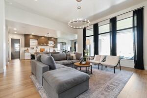 Perched in the scenic foothills of Cartwright Ranch, this contemporary home showcases architectural details that shine with bold, asymmetrical lines, beautifully softened by natural stone and wood accents. With 3 bedrooms, 2.5 baths, an office and a versatile flex room, the thoughtful design complements modern living. The great room, with soaring volume ceilings, frames breathtaking views of the Boise foothills. A gourmet kitchen showcases an oversized island, Thermador appliances and a Butler’s pantry. The primary suite is a retreat with designer feature walls, hardwood flooring and a spa-inspired ensuite complete with heated floors. The climate-controlled garage impresses with epoxy floors, built-in cabinetry, a heater, motorized blinds and a 220V outlet for EV or workshop use. Outside, enjoy a covered patio featuring a fan and fireplace, surrounded by professional landscaping with fruit trees, blueberry bushes, water features and an outdoor shed-all with unobstructed foothill views and no backyard neighbors, ever.