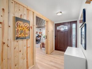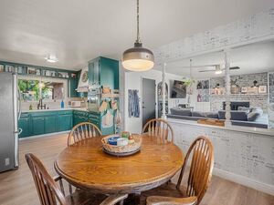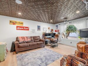 The standout features? A bold, vintage style embossed metal ceiling that adds instant wow factor and flair. Custom barn doors, warm wood accents, and fun retro details throughout give this space a truly one-of-a-kind, energetic vibe. It’s a room that invites creativity and connection. The layout flows effortlessly and features beautiful LVP flooring in the main living areas. The kitchen features vibrant, vintage-inspired touches, giving it a cozy, nostalgic charm that makes the heart of the home truly special.