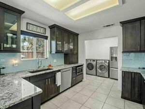 Four of the five bedrooms feature walk-in closets, providing ample storage space in almost every room. The gourmet kitchen is a chef’s delight, featuring granite countertops, stainless steel appliances, and custom cabinetry, all designed for both functionality and style. The outdoor spaces are equally as captivating! The front yard features low maintenance landscaping, mountain views, and a fire pit surrounded by comfortable seating, making it an ideal spot for gatherings with family and friends.