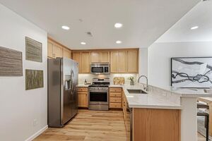 GORGEOUS HOME! Sophisticated & beautifully remodeled, this exceptional Communications Hills condo has been newly updated - quality finishes throughout. Bright & spacious, the open-concept design features soaring ceilings, dramatic windows, recessed lighting, & built-in speakers, creating a welcoming space filled with natural light. The striking kitchen showcases refinished light maple cabinetry, new quartz counters w/ full backsplash, SS appliances, & a deep stainless sink and new fixtures.