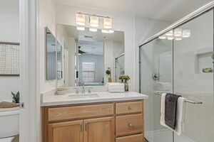 The expansive primary suite is a serene retreat with a generous walk-in closet and a spa-like bath featuring a gorgeous tiled walk-in shower, new quartz counter, stylish fixtures, and sliding entry door. The second full bath has also been refreshed with designer details including a porcelain counter. Step outside to the charming patio, ideal for morning coffee, evening relaxation, or entertaining.