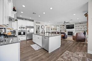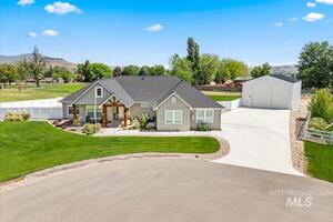 1 acre property with VIEWS! Stunning property with 30 X 50 SHOP! This split-bedroom home boasts engineered hardwood floors, slab granite island, a spacious pantry, and stainless steel appliances. The kitchen has upgraded cabinets, a gas cooktop with a hood, and ample storage. The inviting living space features a cozy gas fireplace with custom cabinets and shelving on each side, while the primary and secondary bathrooms showcase tile showers. A recently added outdoor kitchen is fully equipped with a BBQ smoker, gas grill, sink, refrigerator, and storage, making it perfect for hosting gatherings. Unwind in the incredible American Whirlpool Hybrid swim spa or gather around the gas fire pit for a relaxing evening under the stars. Also features a dog run, garden beds, smart lighting, and nearly entire acre is landscaped and fenced. Shop has 2 14’ RV doors, power, 220V 50 amp, and is insulated.