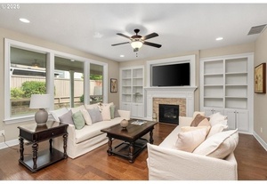 A welcoming and spacious layout opens with hardwoods throughout the main floor, beautiful millwork, and built-ins framing a cozy gas fireplace. The kitchen features granite slab counters, a large island, gas cooktop, built-in oven and microwave, and butler pantry with abundant storage, all connecting seamlessly to the dining room and separate breakfast nook with covered patio access.