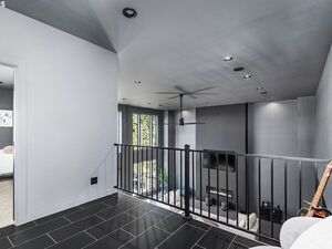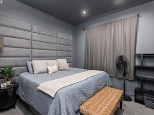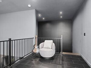 An open-riser staircase leads to the Primary Suite, where you feel as though you’re floating above the treetops with stunning views. The suite includes an oversized closet area with an in-suite washer and dryer, and a luxurious en-suite bathroom featuring a glass-enclosed shower and a 72-inch Native Stone soaking tub with floor-to-ceiling windows. The main-level bedroom is well-appointed, providing comfort and privacy for family members or guests. There is also the option to create a third bedroom by adding a wall and door to the flex space currently used as a dining area. Third bedroom to be completed prior to closing.