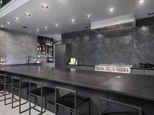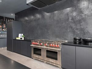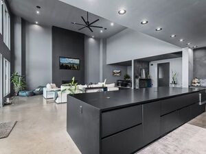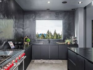 The main living area features soaring ceilings, a cozy fireplace, floor-to-ceiling windows that showcase breathtaking views of the forest & valley. The open-concept great room flows into a gourmet kitchen outfitted with high-end appliances, including a 60-inch Wolf Dual Fuel Range w/ double ovens, Jenn Air appliances: freezerless fridge, dishwasher & microwave drawer. European-style custom cabinetry and an extra-large island make the kitchen perfect for entertaining. The kitchen walls are smooth & glossy traditional Moroccan finish - Tadelakt. A wet bar w/ under-counter fridge, ice maker, & Jenn Air built-in coffee maker for fresh-ground coffee or instant hot water anytime.