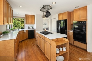 Custom designed Rambler w/ daylight basement offers level entry, privately set down a long concrete driveway. Easy living floorplan offers vaulted ceilings & abundant oak floors, main floor primary suite w/ office space and a large deck captures Sunset Views. Island kitchen has quartz counters, big undermount sink & gas range, plus breakfast nook w/ window seat. At 2590 sf, this 1991 built home is not too big or too small, its JUST RIGHT! Lower level has 2 bedrooms & spacious Rec. Room that opens to a huge tile patio. The easy care yard is beautifully landscaped & irrigated with perennials, trees, berries and more. BIXBY KNOLL, a desirable cul-de-sac of quality homes. The home you have been waiting for!