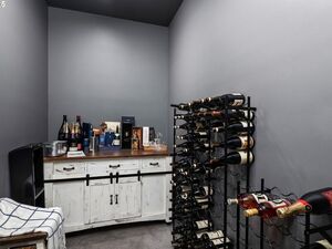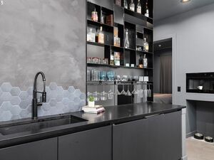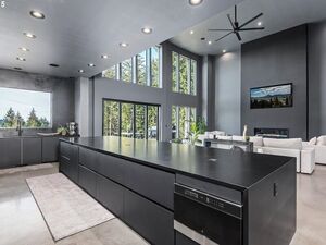 The main living area features soaring ceilings, a cozy fireplace, floor-to-ceiling windows that showcase breathtaking views of the forest & valley. The open-concept great room flows into a gourmet kitchen outfitted with high-end appliances, including a 60-inch Wolf Dual Fuel Range w/ double ovens, Jenn Air appliances: freezerless fridge, dishwasher & microwave drawer. European-style custom cabinetry and an extra-large island make the kitchen perfect for entertaining. The kitchen walls are smooth & glossy traditional Moroccan finish - Tadelakt. A wet bar w/ under-counter fridge, ice maker, & Jenn Air built-in coffee maker for fresh-ground coffee or instant hot water anytime.