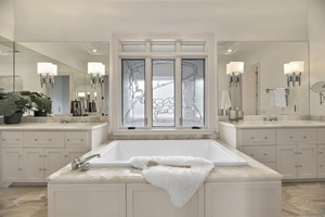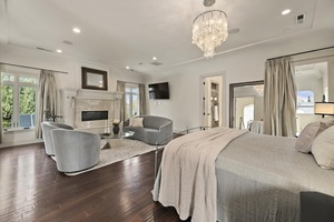 Magnificent Mediterranean Willow Glen Estate. Interior features 3169 square feet with original fireplace in living room, Ensuite on main level, Separate formal dining room with French doors and wainscoting with encased mirrors, Coved ceilings frame custom chandeliers, Gourmet kitchen with Viking appliances surrounded by designer cabinets under granite counters, Primary suite is over 1000 square feet of slate and marble flooring.