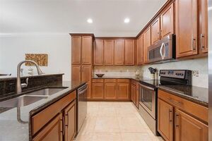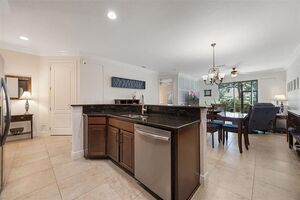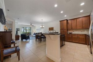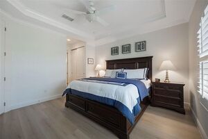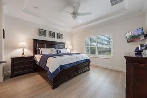 The downstairs primary suite offers a peaceful retreat with plantation shutters and luxury vinyl flooring, tray ceiling and 2 separate closets. The spacious primary ensuite features a garden tub, shower and split vanities, and a generous linen closet. Enjoy cooking in the gourmet kitchen featuring 42-inch solid wood cabinets, granite countertops, and stainless-steel appliances. A new dishwasher adds convenience to your daily routine. The extended, screened-in patio overlooks the first tee of Eagle Creek Golf Course, offering serene views and upgraded landscaping.