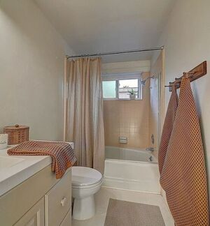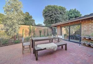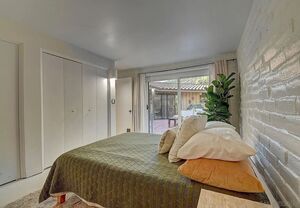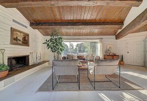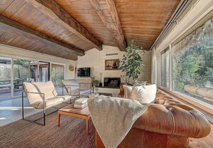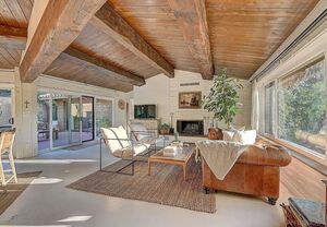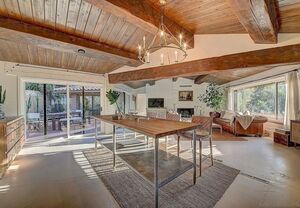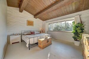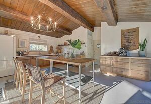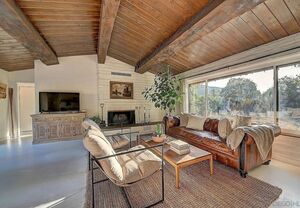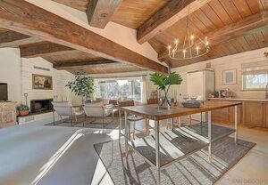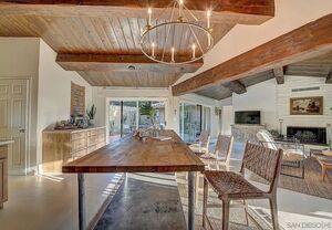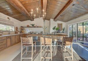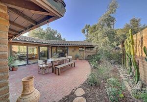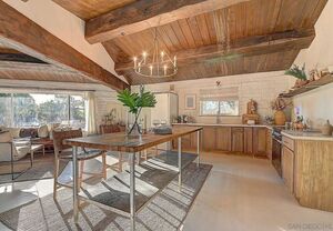 At the heart of this home is the unmistakable craftsmanship of the Weir Brothers, renowned adobe builders whose legacy includes some of the most admired homes in Rancho Santa Fe, Poway, and Valley Center. Signature details include hand-formed adobe block construction, original Douglas fir beams salvaged from WWII barracks, wood ceilings, and a classic adobe-style fireplace, all contributing to unmatched energy efficiency and timeless architectural beauty. Inside, the home features a remodeled kitchen that perfectly balances modern upgrades with mid-century design flair-think clean lines, warm textures, and Instagram-worthy styling. The living and dining spaces are bathed in natural light, with large windows that frame the private brick patio and yard. Newer dual-pane windows were added to preserve the home’s character while enhancing insulation and efficiency.