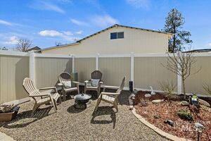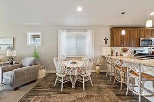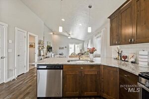 Discover your dream home - a stunning single-level retreat where every detail has been thoughtfully designed for modern living. This nearly new, turnkey residence features an open floor plan with soaring vaulted ceilings and expansive windows that flood the space with natural light. The gourmet kitchen boasts granite countertops, a gas oven and cooktop, and custom cabinetry complemented by a sweeping breakfast bar, perfect for entertaining. Enjoy luxury throughout with upgraded LVP hardwood floors, beautiful woodwork, and energy-efficient touches including a tankless water heater and SS appliances. The spacious master suite offers a step-in shower, dual vanities, a walk-in closet, and a chic accent wall, while additional living spaces provide ample storage. Step outside to a covered patio with a rural view-ideal for morning coffee or outdoor gatherings-and a low-maintenance, fully landscaped yard featuring pavers and a dedicated garden space.