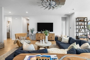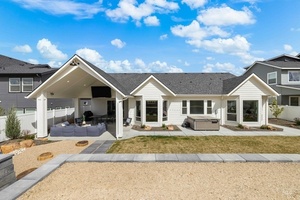 Dry Creek Ranch - this like-new single-level farmhouse has been freshly priced to sell. Situated on a 1/3 acre lot, the home offers 4 bedrooms including 2 suites and a Jack & Jill, 3.5 baths, an office, and a split-bedroom design ideal for guests or multi-gen living. The oversized 4-car tandem garage with epoxy floors provides rare storage and parking flexibility. Interior upgrades include hardwood floors, quartz counters, custom lighting, motorized blinds, and whole-home water treatment with humidifier, softener, and filtration system. The backyard features an extended patio and tiered hillside - perfect for gardening, entertaining or relaxation. Enjoy the unmatched resort lifestyle of Dry Creek Ranch with clubhouse, gym, coffee shop, community farm, two pools, parks, trails, and top-rated Eagle schools.