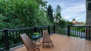 Upstairs, three bedrooms and a dedicated office with hardwood flooring provide space for rest or work. The primary suite is a private retreat, featuring a sitting area, its own deck, his and hers closets, and a luxurious bathroom with a soaking tub and walk in shower.