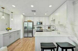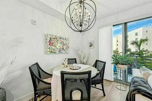 The interior dazzles with a myriad of upgrades: 4-panel hurricane-rated sliding glass doors, linear tile flooring in the bathrooms, oversized handles on kitchen cabinets, and elegant backsplashes. The open-plan kitchen, dining, and living area is illuminated by bright, natural light and appointed with modern glossy light cabinets, bright quartz countertops, and a large island with chic lighting-ideal for entertaining or casual dining.