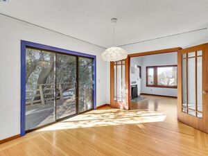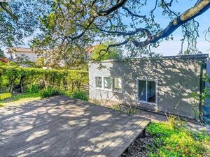 A terraced garden features a raised Zen deck under a canopy of Coast Live Oak trees. Original hardwood floors and Mediterranean details throughout the home add character and timeless elegance. The lower level is a versatile space with its own entrance, a full bath, and a lofty, creative room-perfect for an art studio, office, or guest quarters.
