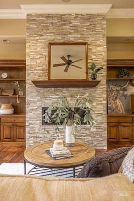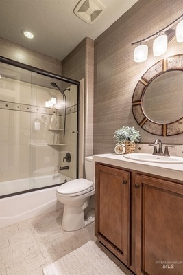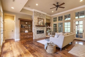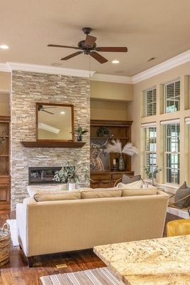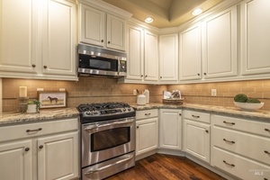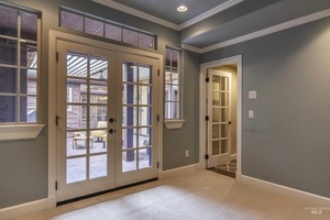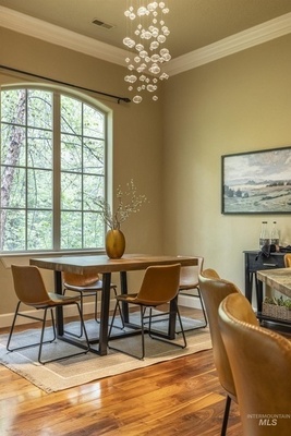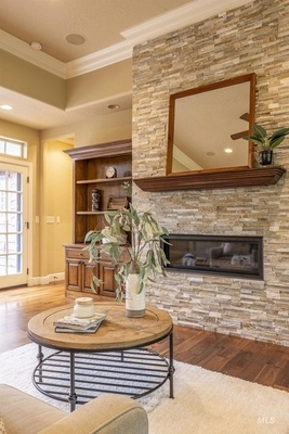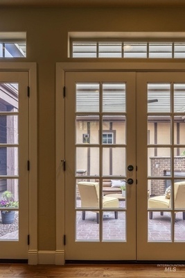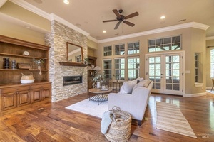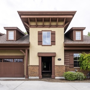Sophisticated Townhome in Private Gated Community, Rivers Bend! Nestled against a tranquil nature preserve along a tributary of the Boise River, this elegant townhome offers privacy, comfort, and upscale features in a secure community with no rear neighbors and gated greenbelt access. Inside, enjoy rich walnut hardwood flooring throughout main living areas and a split floor plan with two spacious primary suites-perfect for guests or multi-generational living. The primary bathroom boasts heated tile floors for year-round comfort. Entertain with ease in your private courtyard, featuring a built-in BBQ and outdoor fireplace, or relax in the screened-in back porch. The HOA covers most exterior maintenance such as the roof, exterior painting, community landscaping, snow removal, so you can enjoy a carefree lifestyle surrounded by nature.