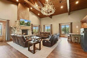 Separate double gates allow access to pasture or future second home or shop to the west. Indoors, enjoy the game room with a bar, full-size refrigerator, and bathroom. The huge roaring fireplace features real stone and wood mantle, complemented by blackout shades. Additional features: tankless water heater, water treatment, built-in basketball hoop, and professional landscaping.