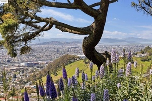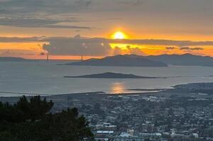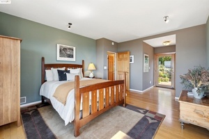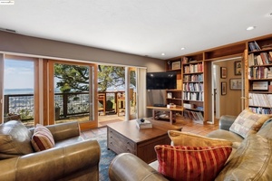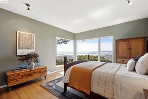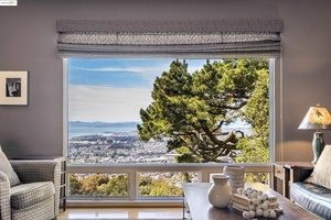 Elegance meets functionality, living in this beautifully upgraded and meticulously maintained c.1940s home. Tucked behind a private gate, enter a lush courtyard garden-designed to attract birds, butterflies, and bees-sets a peaceful tone. The entry showcases stunning leaded glass doors by acclaimed artist Theodore Ellison. Inside, panoramic views of San Francisco, the Golden Gate, and beyond steal the show.