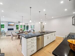 Step into a spacious kitchen that serves as the heart of the home, featuring a beautiful black quartz island, elegant white shaker cabinets, and ample space designed for entertaining. It flows seamlessly into a cozy family room with a welcoming gas fireplace, creating the perfect setting for gatherings with friends and family.