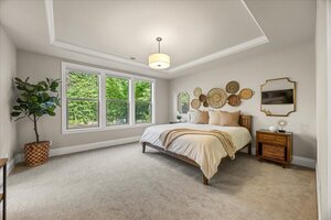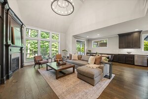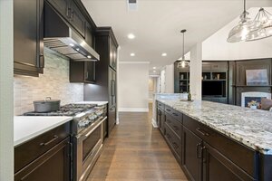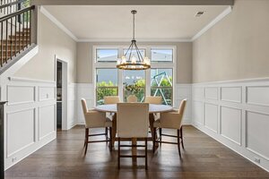 The kitchen is a chef’s dream, with a large island, convection oven, six-burner stove, under-cabinet lighting, and a built-in fridge. A butler’s pantry connects to the formal dining room, adorned with wainscoting. A second breakfast area includes a built-in buffet and a glass slider to the backyard, ideal for indoor/outdoor entertaining.
