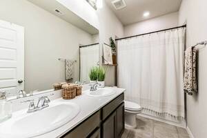 Welcome to this energy-efficient 4-bedroom, 3-bath home with a smart floor plan offering privacy and flexibility. At the front, a bedroom with full bath is perfect for guests or a mother-in-law suite. Two bedrooms in the center share a game room, while the private primary suite features a spacious bath with dual sinks, soaking tub, and separate shower. The owner extended the covered patio in 2024 by 15 ft., creating an ideal outdoor living space. Located in a desirable community with lakes, pool, and recreation center at the back of the subdivision for a quieter lifestyle. Conveniently close to schools, shopping, dining, and major services, this home blends comfort, function, and location all in one.