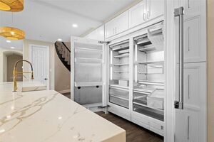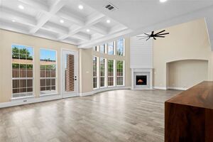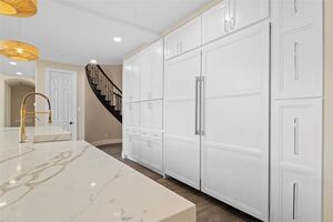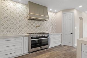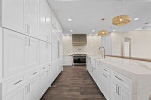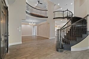 The grand rotunda entry with a sweeping staircase, Juliet balconies, and ornate iron railings makes a stunning first impression. Engineered hardwood flooring, statement chandeliers, custom lighting, and rich architectural details enhance every room. The heart of the home is a gourmet kitchen anchored by a 13-foot quartz waterfall island with Saman wood accents. Enjoy pro-grade appliances-dual dishwashers, double ovens, 8-burner gas range, oversized built-in fridge and freezer, and custom cabinetry. Perfect for entertaining or everyday living, the kitchen overlooks a sunny breakfast area and opens to the spacious family room with soaring 18-foot ceilings and a dramatic floor-to-ceiling shiplap fireplace.