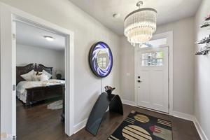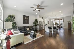 The unit features a professional kitchen with stainless appliances, stone countertops, and a large kitchen island with views to the living and large dining room. The entire home features modern lighting.