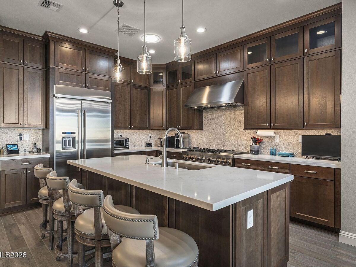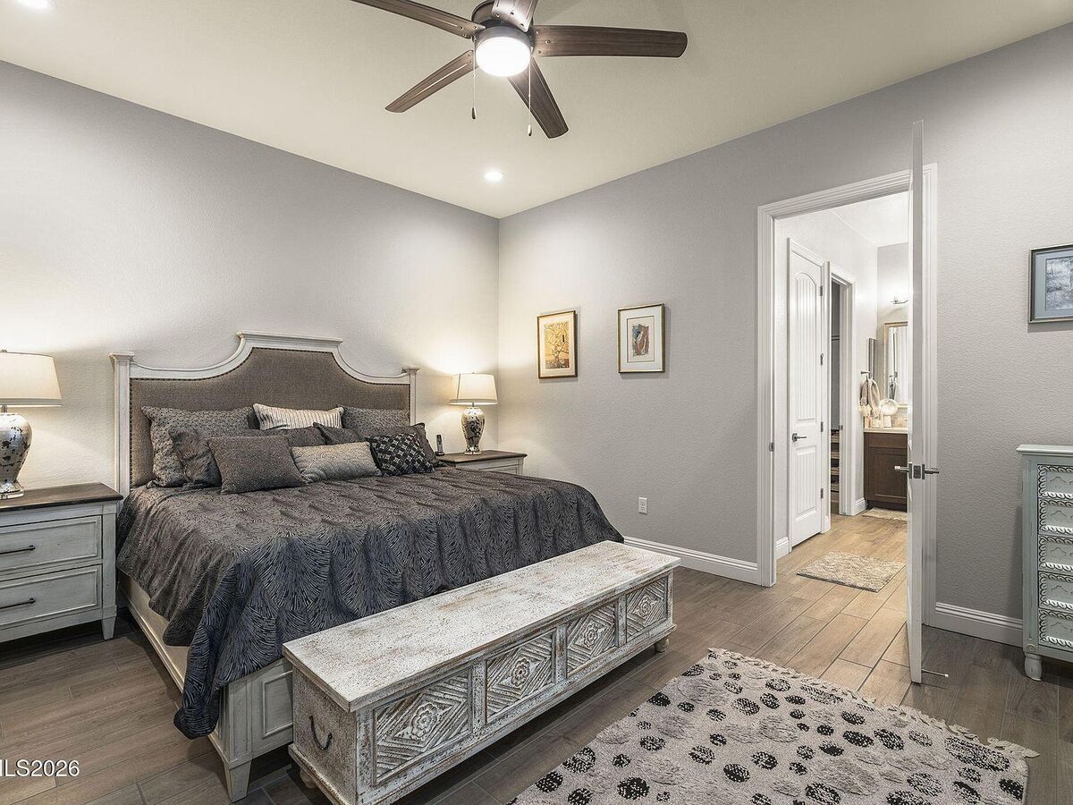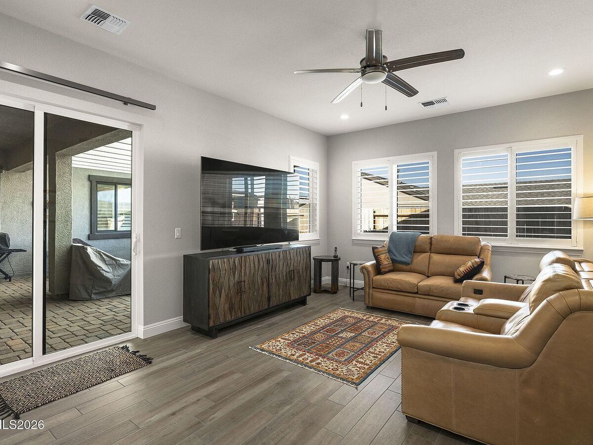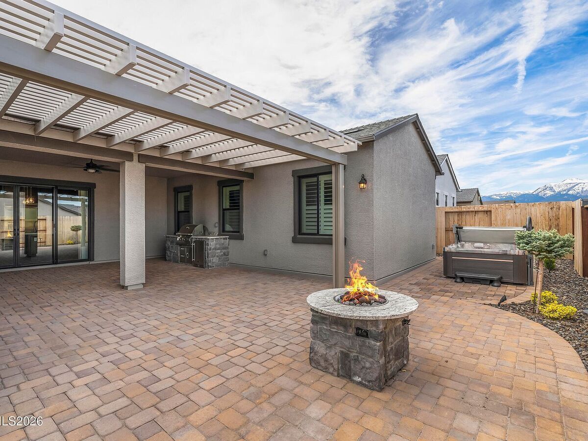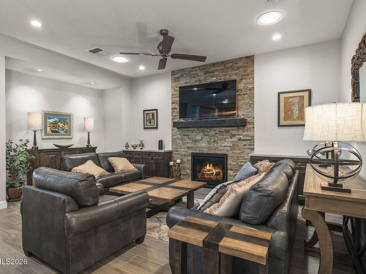 Don’t wait to build, move right in and experience luxury, comfort, and thoughtful design in this impeccably upgraded home in South Reno’s highly sought-after 55+ community. Every detail has been elevated, with over $350,000 in builder and owner upgrades inside and out. The open great room is enhanced with custom cabinetry framing the gas fireplace and brightened with four solar tubes. The gourmet kitchen boasts premium Jenn-Air appliances, a custom pantry, and a large island. Just around the corner you will find a built-in bar with wine fridge-perfect for entertaining. Both a dedicated office and a separate game room with half bath and walk-in closet provide flexible space for work and play. The primary suite offers true spa-like comfort with a roll-in shower and custom walk-in closet. Step out back through retractable screen doors to a covered back patio with a ceiling fan, a built-in Echelon BBQ and outdoor refrigerator with granite countertops, an extended pergola covered patio, and a plumbed in fire pit with mountain views -your own personal outdoor oasis. The garage is as refined as the rest of the home, featuring epoxy flooring, custom cabinets, a workbench, and retractable ceiling racks for smart, organized storage. Every inch of this home, from its xeriscaped front yard to its brand new private spa, blends style with practical comfort. 2289 White Clay Drive is more than a home-it’s a complete lifestyle upgrade, offering resort-quality living in Reno’s most desirable retirement community.